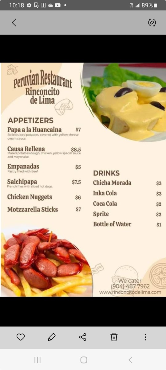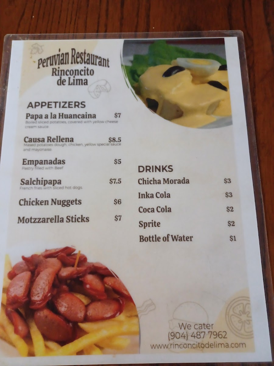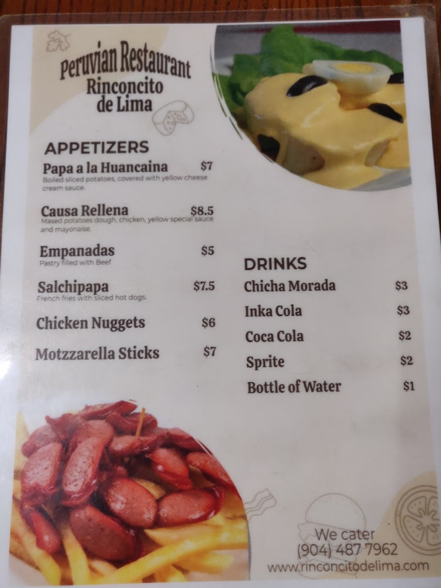 Introducing the vibrant flavors of El Rinconcito de Lima, a hidden gem located at 7300 Beach Blvd, Jacksonville, FL. This family-owned restaurant specializes in authentic Peruvian cuisine that delights the senses. Start your culinary journey with their Sopa a la Minuta, a comforting noodle soup enriched with beef and spices, or savor the Fideos a la Huancaina con Lomo, a creamy pasta dish elevated with sautéed beef, tomatoes, and onions.
